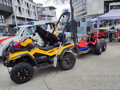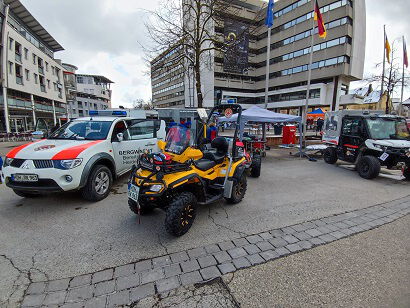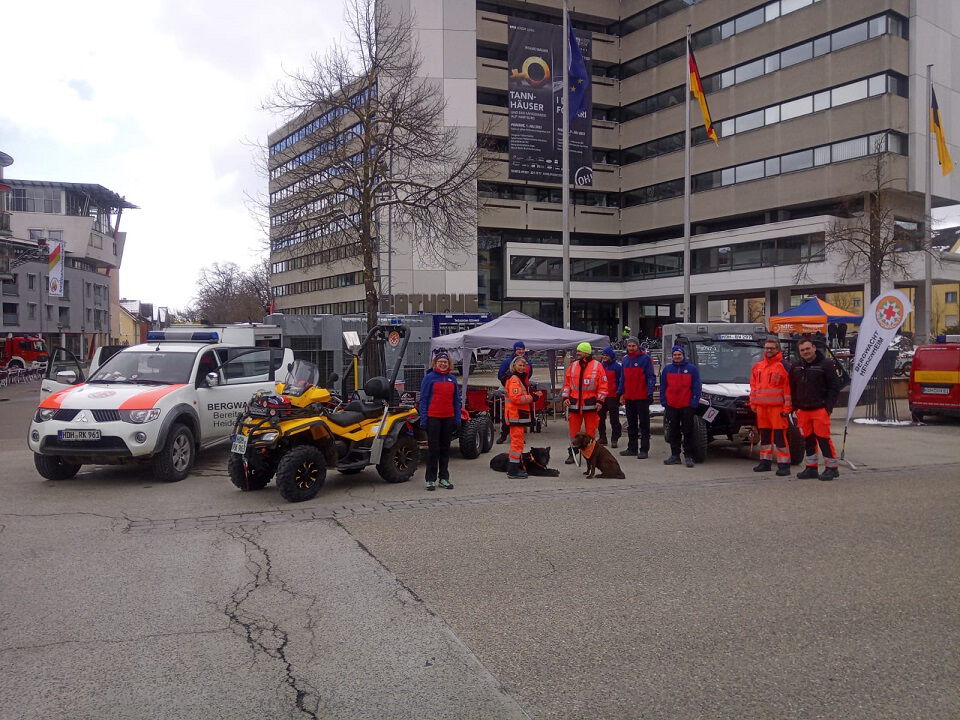 Die Bergwachtgruppen aus Heidenheim und Herbrechtingen stellten am Outdoortag ihre geländegängigen Allradfahrzeuge und die Gebirgstrage mit Zubehör in der Heidenheimer Innenstadt aus. Weitere Rettungsorganisationen, wie THW, Feuerwehr oder die Rettungshundestaffel präsentierten sich ebenfalls auf dem Rathausplatz. Letztere kamen mit ihren Vierbeinern auf einen Fototermin vorbei. Das Wetter an diesem Tag, an den sich auch ein verkaufsoffener Sonntag anschloß, war leider sehr kalt und auf den Höhen der Alb lag sogar Schnee. Dementsprechend war die Besucherresonanz. Tagsüber waren aber doch einige Fragen interessierter Besucher rund um die Fahrzeuge, Ausrüstung und zur Bergwacht im speziellen von den Rettungskräften zu beantworten.