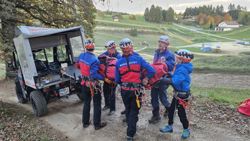 Am Samstag fand die abgespeckte Version der vorgesehenen 24 Stunden Übung statt. Insgesamt beteiligten sich 12 Einsatzkräfte und vier Jugendliche an der, wegen Sanierungsmaßnahmen in der Rettungsstation, nur eintägigen Übung. Bei drei Einsatzszenarien mit geschminkten Mimen im steileren Waldgelände und auf der Motocrossstrecke in Gerstetten, übte man die sanitätsdienstliche Versorgung, Aufbau der Satikseile, der anschließende Abtransport mit Gebirgs -und Rettungstrage sowie das Fahren im Gelände mit dem UTV (siehe Bilder) realistisch. Außerdem folgten auf der Hohen Wart noch verschiedene Fallbespiele mit aufgefundenen, verunfallten Personen. Hier war der Erstbefund und daraus resultierende Maßnahmen zur Stabilisierung der Patienten gefordert. Das Anlegen einer sogenannten "Beckenschlinge" zur Fixierung einer Beckenfraktur war ebenso Bestandteil im Vormittagsprogramm. Aus der Theorie und Praxis konnten tagsüber wieder einige Verbesserungen für künftige Einsätze gewonnen werden. Zwischen den praktischen Einheiten besuchte man die Höhenrettungsgruppe der Berufsfeuerwehr Ulm. Nach einem informativen Vortrag wurde das doch unterschiedliche Material der Höhenretter im Gegensatz zur Bergwacht vorgestellt aber auch die vielfälltige technische Ausrüstung der Feuerwehrfahrzeuge. Danach ging es, bedingt durch zwei reale Unfälle dort in diesem Jahr, zu Übungseinsätzen auf der Gerstetter Crossstrecke und weiter zur "letzten Station des Tages" in die Wirtschaft.