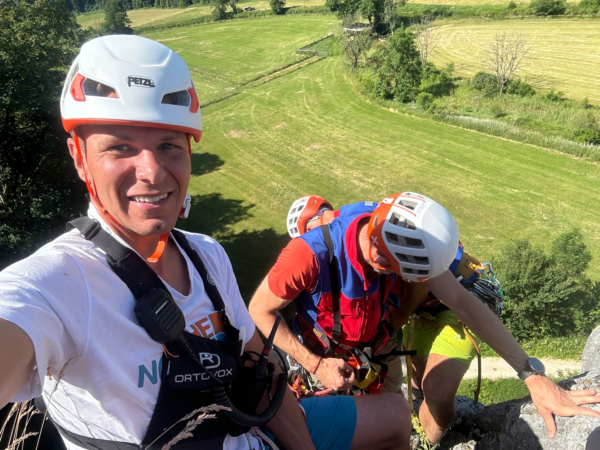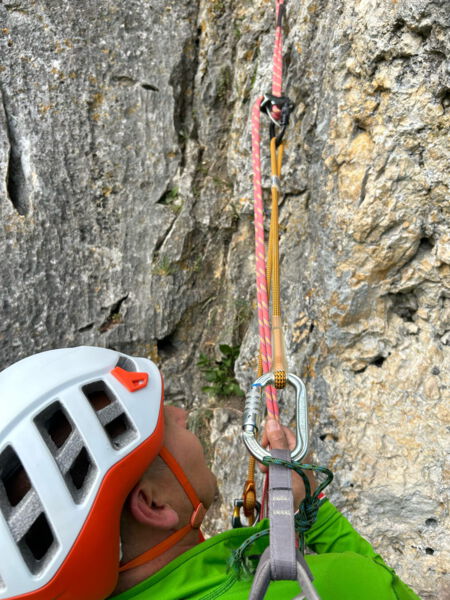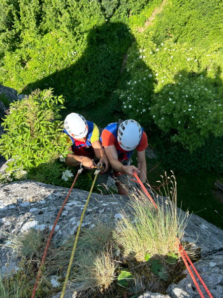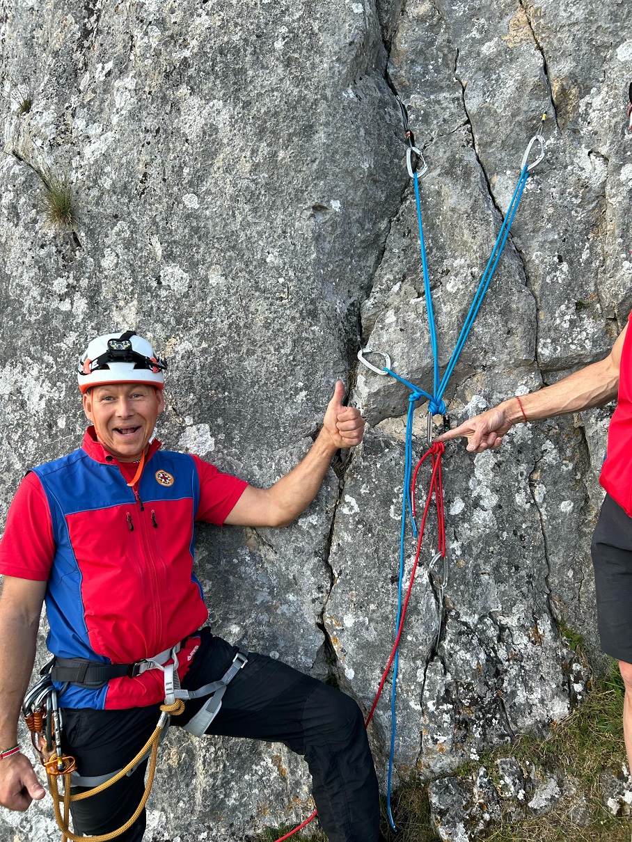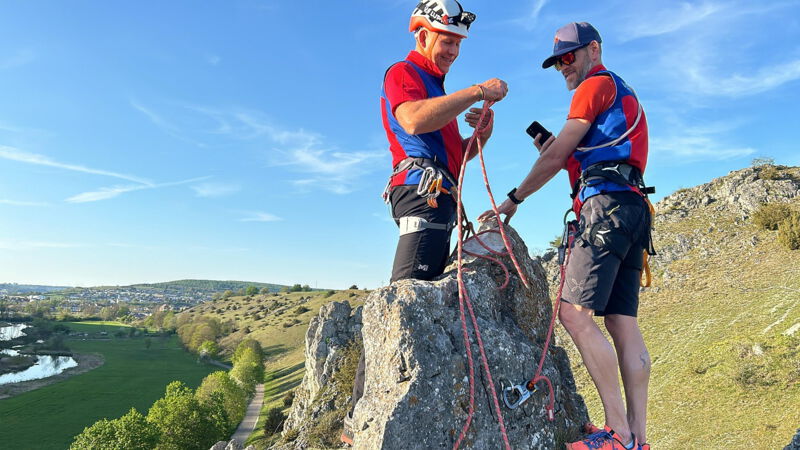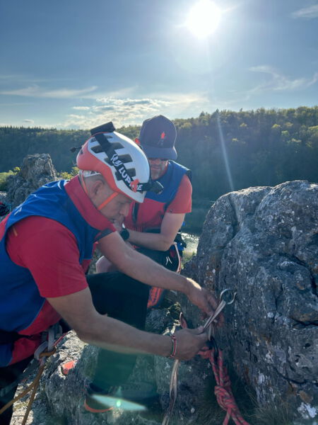 Nicht nur die hohen Anforderungen sondern auch die warmen Temperaturen brachten unsere angehenden Einsatzkräfte Florian Schöffler und Thomas Aumüller auf der Alb zum Schwitzen. Sven und Andi, unsere technischen Leiter Sommer, investierten mit Flo und Thomas viel Freizeit und bereiteten sie in praktischen Ausbildungseinheiten in den letzten Monaten auf die Zulassung zur Bergrettungsprüfung Sommer vor. Wie sich letztes Wochenende am Reußenstein bei Schopfloch herausstellte hat sich diese lange, intensive Zeit des Übens bezahlt gemacht. Sie erfüllten beide die Anforderungen des Landesverbandes in Kletter, -Sicherungs, -Seiltechnik, Standplatzbau, die plan-und behelfmäßigen Rettungsmethoden und sind jetzt zur Bergrettungsprüfung Sommer zugelassen. Glückwunsch dazu und nun heißt es noch alle Daumen drücken für die am kommenden Wochenende stattfindende Sanitätsprüfung.