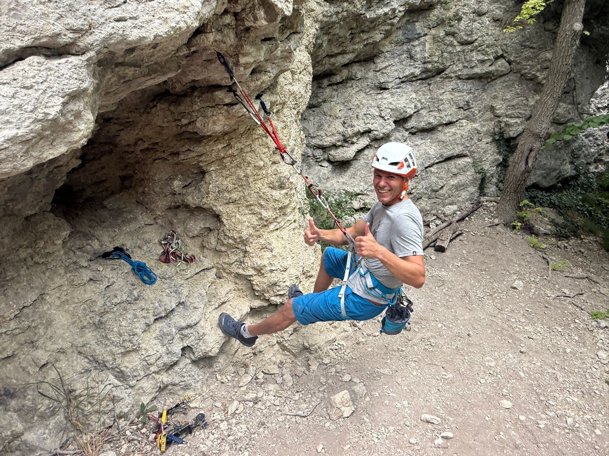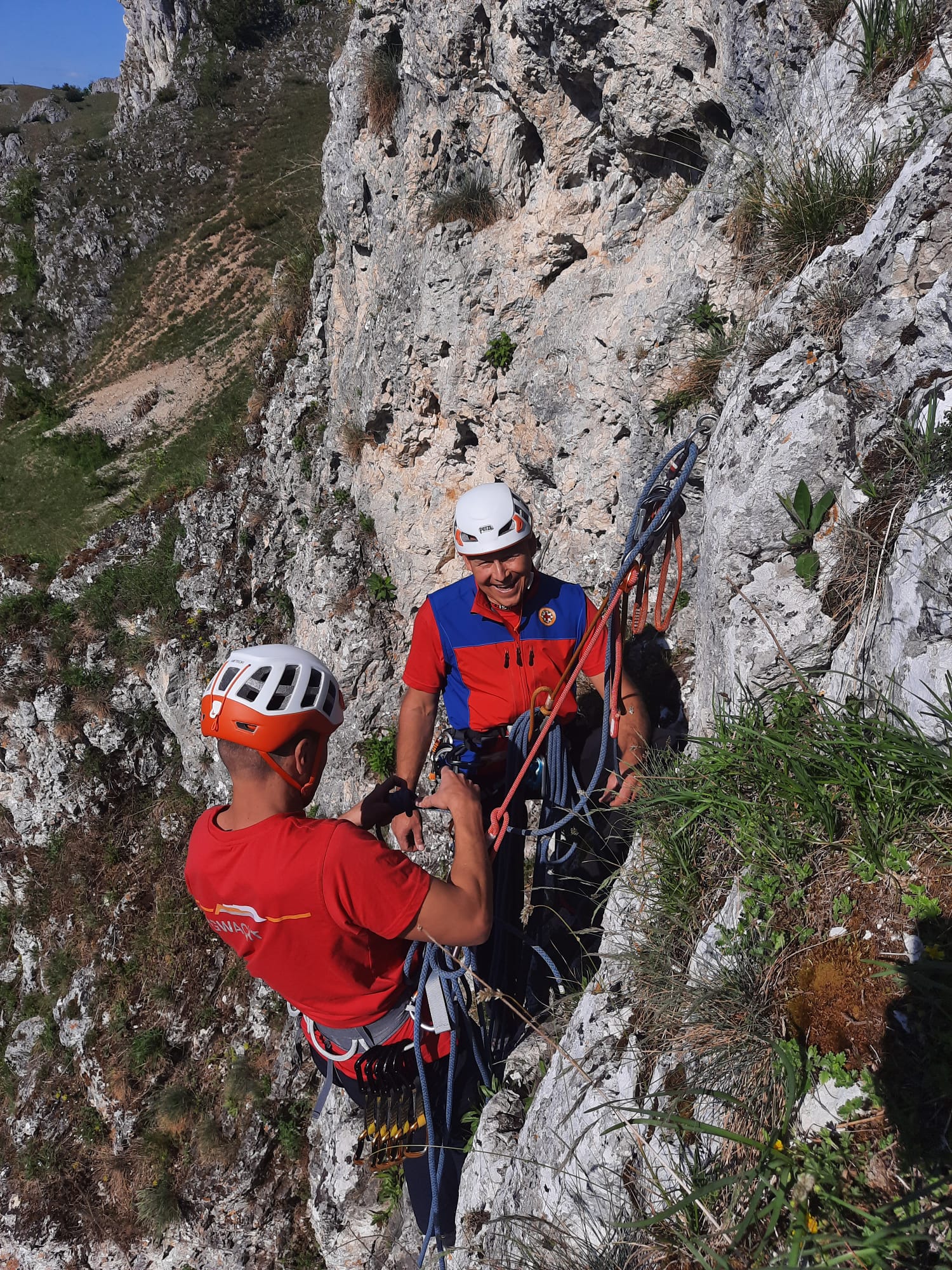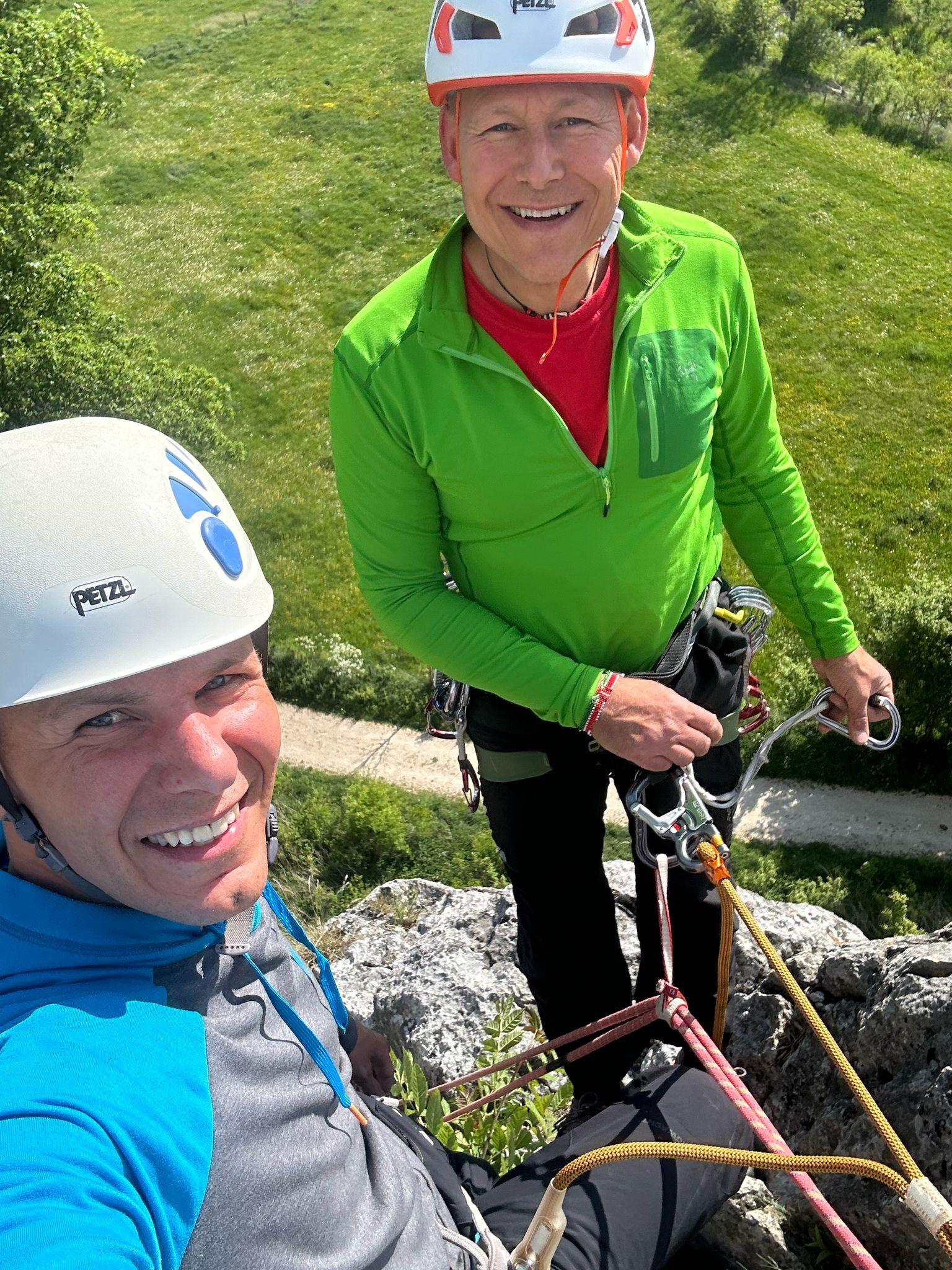 Nicht nur die hohen Anforderungen sondern auch die warmen Temperaturen brachten unsere angehenden Einsatzkräfte Florian Schöffler und Thomas Aumüller auf der Alb zum Schwitzen. Sven und Andi, unsere technischen Leiter Sommer, investierten mit Flo und Thomas viel Freizeit und bereiteten sie in praktischen Ausbildungseinheiten in den letzten Monaten auf die Zulassung zur Bergrettungsprüfung Sommer vor. Wie sich letztes Wochenende am Reußenstein bei Schopfloch herausstellte hat sich diese lange, intensive Zeit des Übens bezahlt gemacht. Sie erfüllten beide die Anforderungen des Landesverbandes in Kletter, -Sicherungs, -Seiltechnik, Standplatzbau, die plan-und behelfmäßigen Rettungsmethoden und sind jetzt zur Bergrettungsprüfung Sommer zugelassen. Glückwunsch dazu und nun heißt es noch alle Daumen drücken für die am kommenden Wochenende stattfindende Sanitätsprüfung.