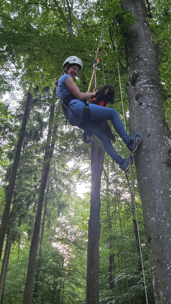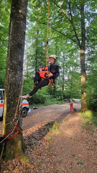 Bei bestem Wetter besuchten Mitglieder der DRK Rettungshundestaffel mit ihren Hunden die Bergwacht auf der Hohen Wart. Im nahen Wald war schon alles für die Aktion „Höhenluft“ vorbereitet. Die Hundegeschirre und Hüftgurte wurden angelegt und nach dem Einhängen in das Seil nochmals angepasst. Am einfachsten geht es mit der Selbstsicherungsschlinge der Bergwacht. Hier bieten sich die verschiedensten Einstellmöglichkeiten mit dem geringsten Aufwand an Material an. Mit vereinten Kräften zog der Rest der Mannschaft kräftig am Zugseil des im Baum installierten Flaschenzuges und beförderte so die im Seil hängenden nach oben. Mehrfach war es den Beteiligten möglich sich in die Höhe ziehen zu lassen. Durchweg fühlten sich hier die Hundeführerinnen mit ihren großen und kleinen Vierbeinern sozusagen „Pudelwohl“ und hatten sichtlich Spaß an der nicht alltäglichen Aktion.