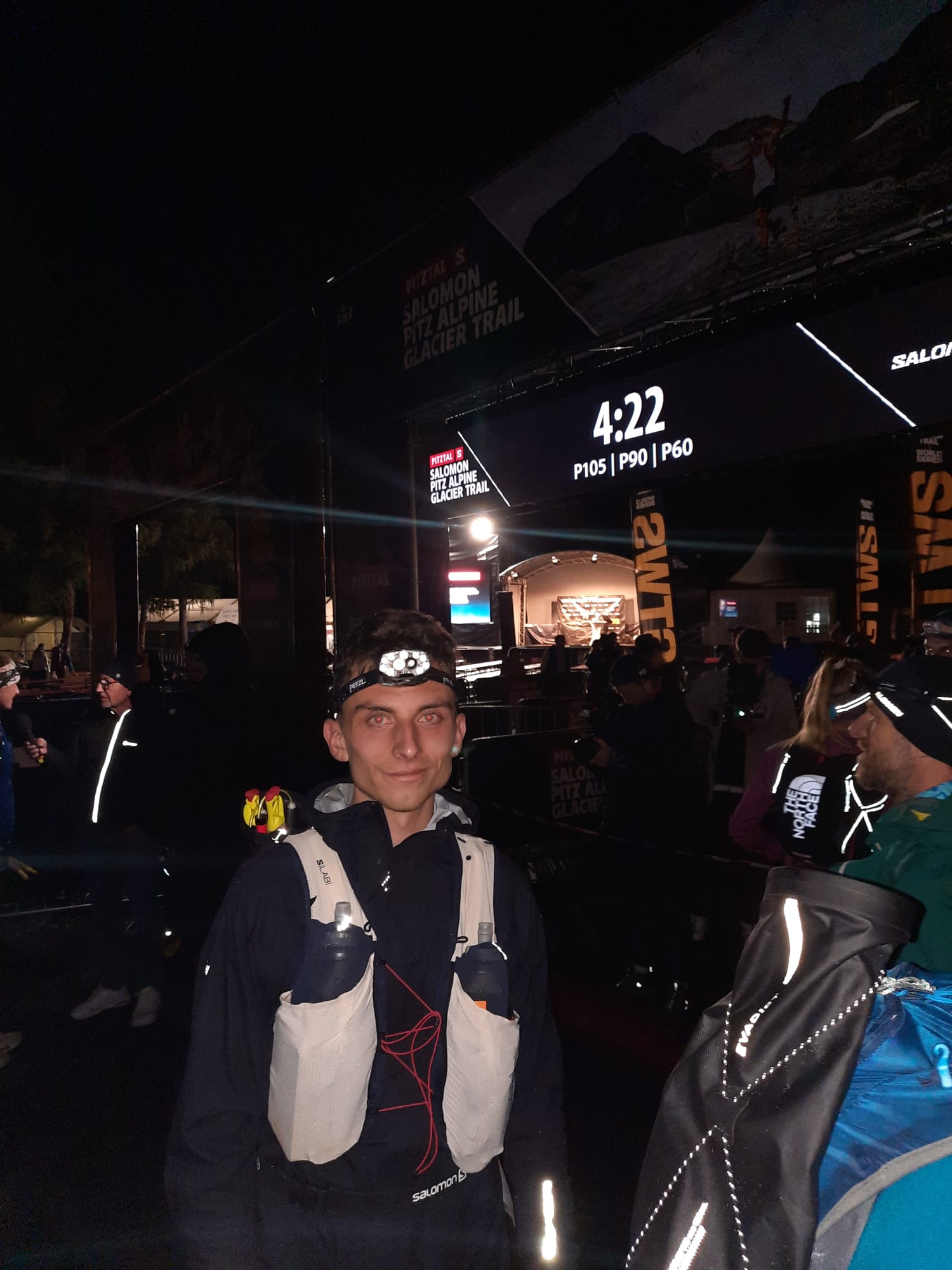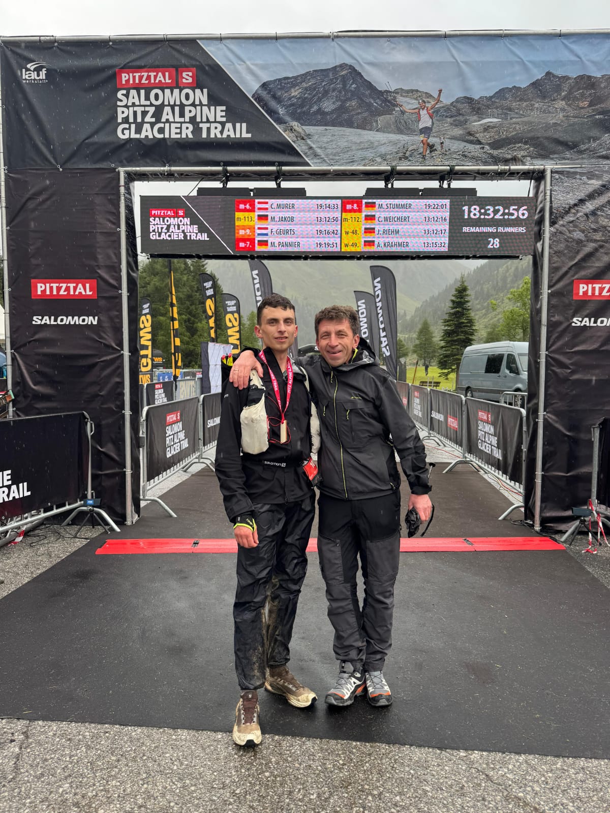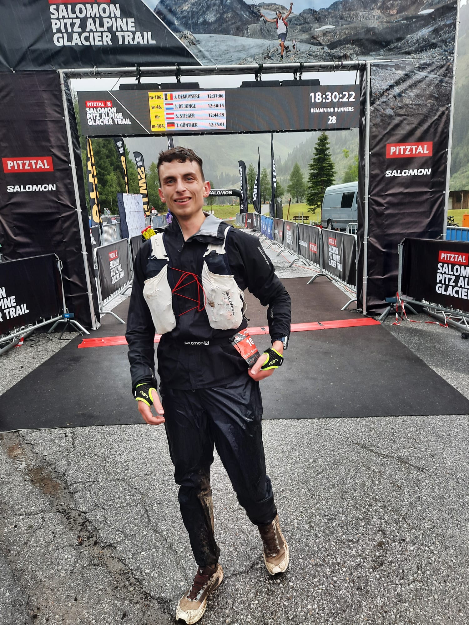 Im Schein der Stirnlampen ging es am Freitagnacht um 23 Uhr auf den ersten Streckenabschnitt. Dieser führte auf 7,5km und 1400 Höhenmeter steil bergauf über den Mittagskogel zur Bergstation des Pizexpress im Skigebiet. Hier lag Sandro mit 1:44:35 Std. an siebter Stelle. Auf dem Rückweg nach Mandarfen (1675m) überquerten die Läufer den Gletscher. Im Tal angekommen folgten immer wieder längere Auf -und Abstiege zu verschiedenen Hütten, wie z. B. zum Taschachhaus (2434m) über den Fuldaer Höhenweg oder zur Kaunergrathütte (2817m). Das schlechte Wetter forderte konzentriertes Laufen, denn die Strecke war nass, matschig und dadurch auch sehr rutschig, was es für die Läufer äußerst schwer machte und viel Zeit kostete. Einige Trails mussten vom Veranstalter auch kurzfristig geändert werden. Die Zwischenzeiten und Platzierungen waren über die GPS Daten der Läufer im Internet abzurufen. Auf den letzten Kilometern vor dem Ziel waren plötzlich aktuelle Zeiten und sein Name auf den Anzeigen gecancelt. War etwa beim Abstieg vom Riffelsee etwas passiert? Nach 10 Minuten der Ungewissheit klärte sich alles auf. Die Technik hatte versagt und übermittelte kurzzeitig kein GPS Signal. Er kam Samstagabend nach 19:29:39 Std. ins Ziel und belegte damit unter den Top 10 den sensationellen neunten Platz insgesamt und Platz sieben in seiner Altersgruppe. Insgesamt finishten nur 18 Teilnehmer. Sein Vater Andreas, welcher ihn vor Ort unterstützte, gratulierte ihm als erster. Das Wetter hatte sich die ganze Zeit nicht gebessert, darum ist die Platzierung unter diesen Bedingungen als sehr gut zu bewerten.