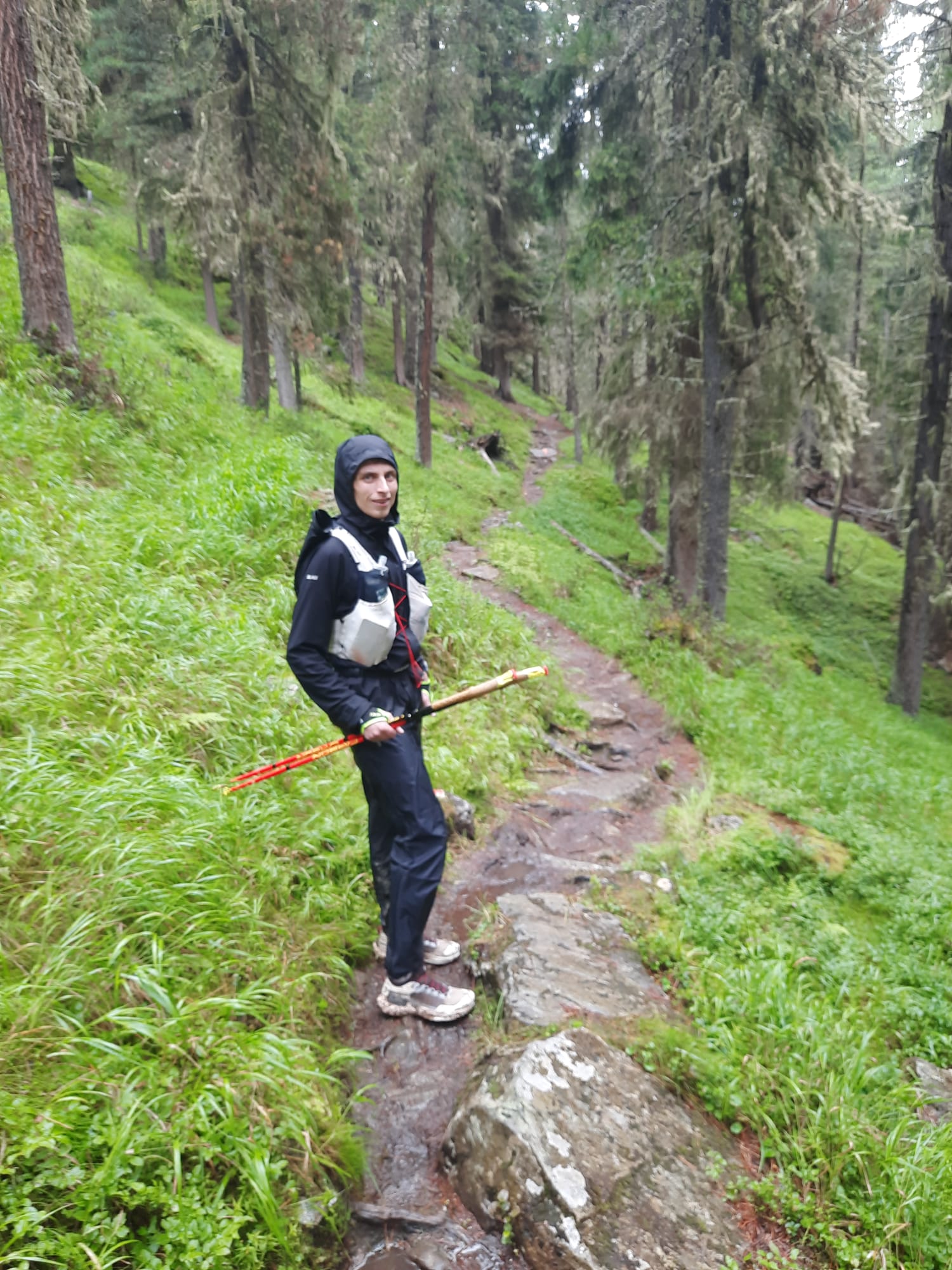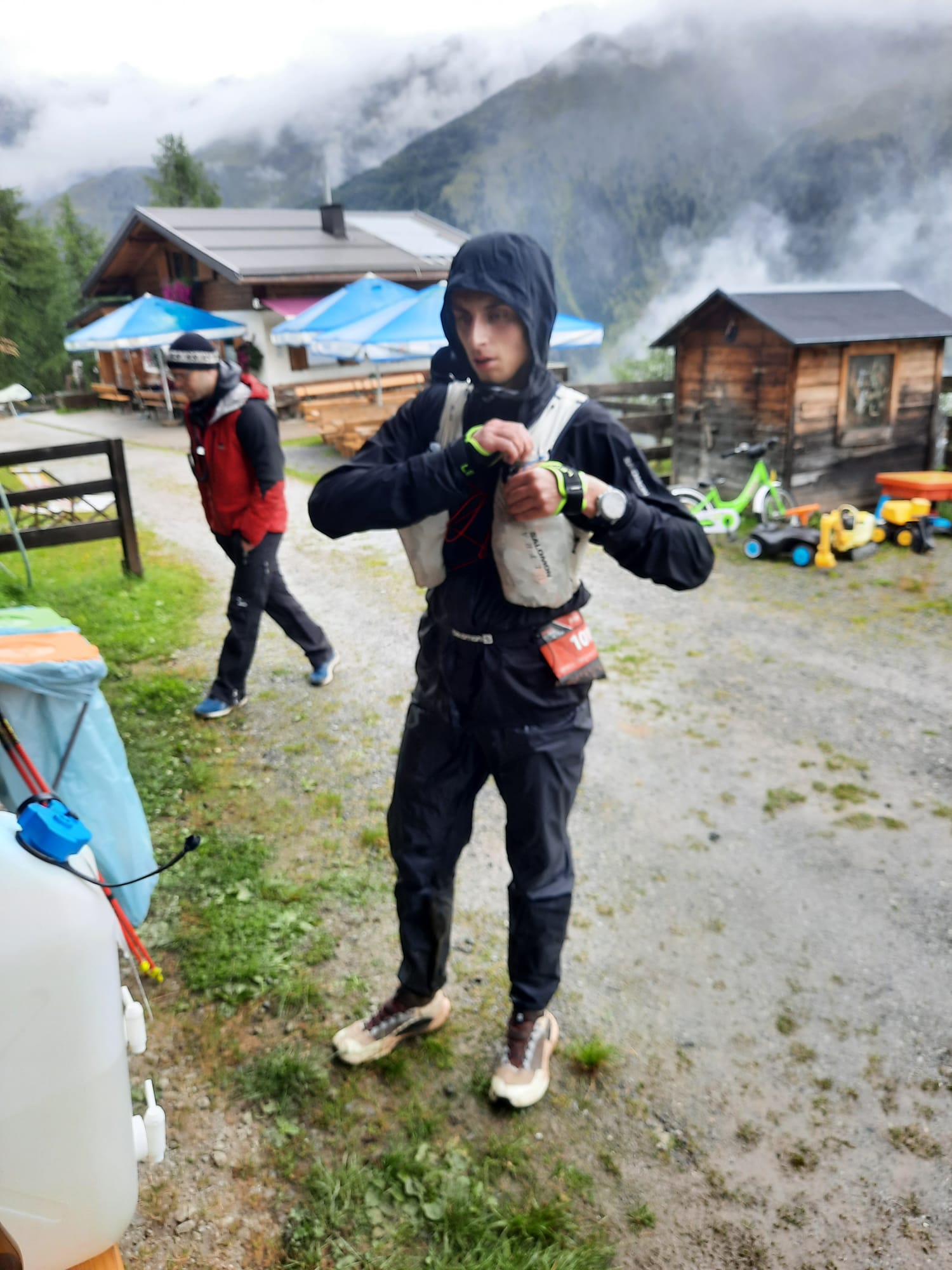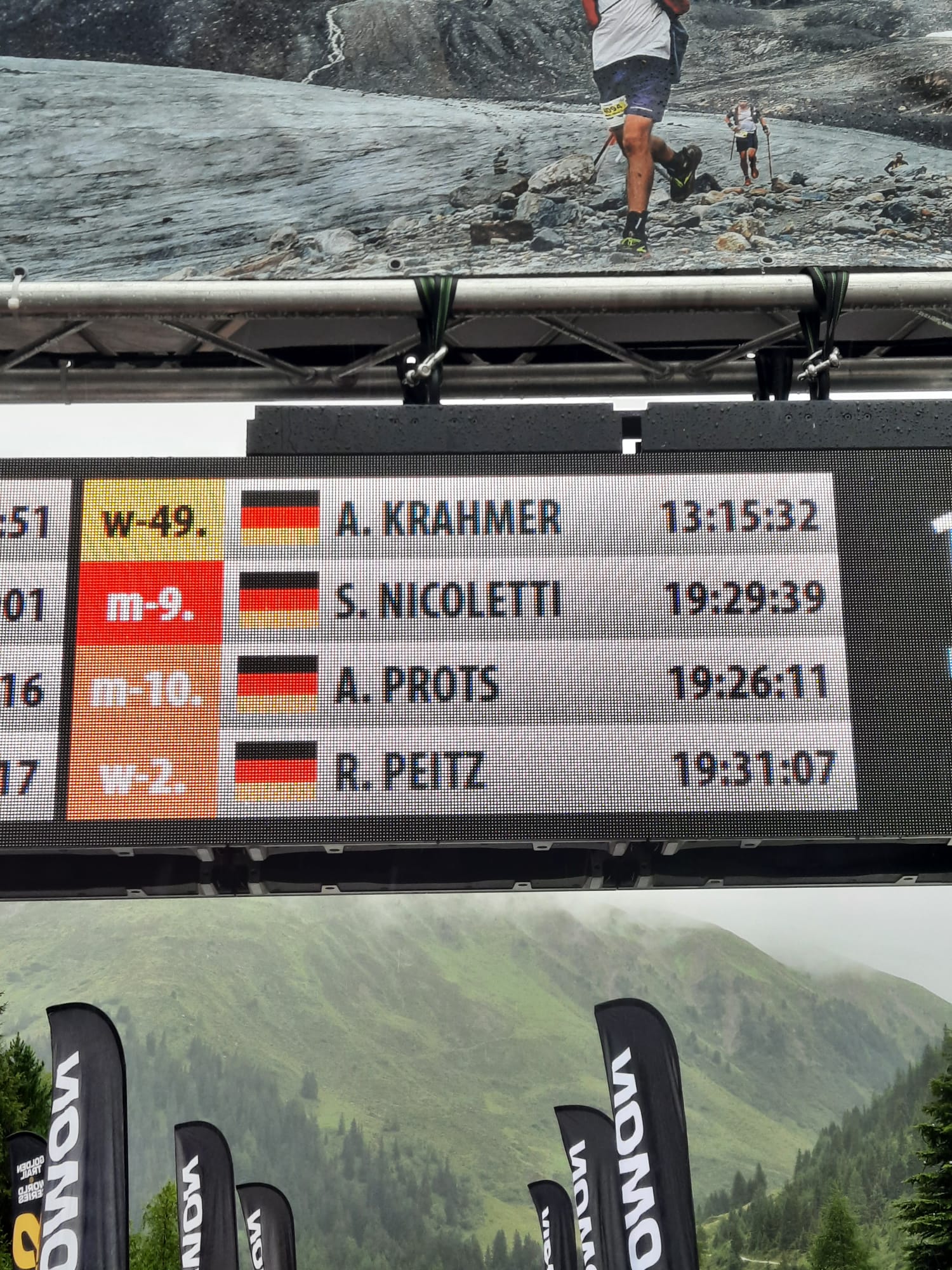 Im Schein der Stirnlampen ging es am Freitagnacht um 23 Uhr auf den ersten Streckenabschnitt. Dieser führte auf 7,5km und 1400 Höhenmeter steil bergauf über den Mittagskogel zur Bergstation des Pizexpress im Skigebiet. Hier lag Sandro mit 1:44:35 Std. an siebter Stelle. Auf dem Rückweg nach Mandarfen (1675m) überquerten die Läufer den Gletscher. Im Tal angekommen folgten immer wieder längere Auf -und Abstiege zu verschiedenen Hütten, wie z. B. zum Taschachhaus (2434m) über den Fuldaer Höhenweg oder zur Kaunergrathütte (2817m). Das schlechte Wetter forderte konzentriertes Laufen, denn die Strecke war nass, matschig und dadurch auch sehr rutschig, was es für die Läufer äußerst schwer machte und viel Zeit kostete. Einige Trails mussten vom Veranstalter auch kurzfristig geändert werden. Die Zwischenzeiten und Platzierungen waren über die GPS Daten der Läufer im Internet abzurufen. Auf den letzten Kilometern vor dem Ziel waren plötzlich aktuelle Zeiten und sein Name auf den Anzeigen gecancelt. War etwa beim Abstieg vom Riffelsee etwas passiert? Nach 10 Minuten der Ungewissheit klärte sich alles auf. Die Technik hatte versagt und übermittelte kurzzeitig kein GPS Signal. Er kam Samstagabend nach 19:29:39 Std. ins Ziel und belegte damit unter den Top 10 den sensationellen neunten Platz insgesamt und Platz sieben in seiner Altersgruppe. Insgesamt finishten nur 18 Teilnehmer. Sein Vater Andreas, welcher ihn vor Ort unterstützte, gratulierte ihm als erster. Das Wetter hatte sich die ganze Zeit nicht gebessert, darum ist die Platzierung unter diesen Bedingungen als sehr gut zu bewerten.
