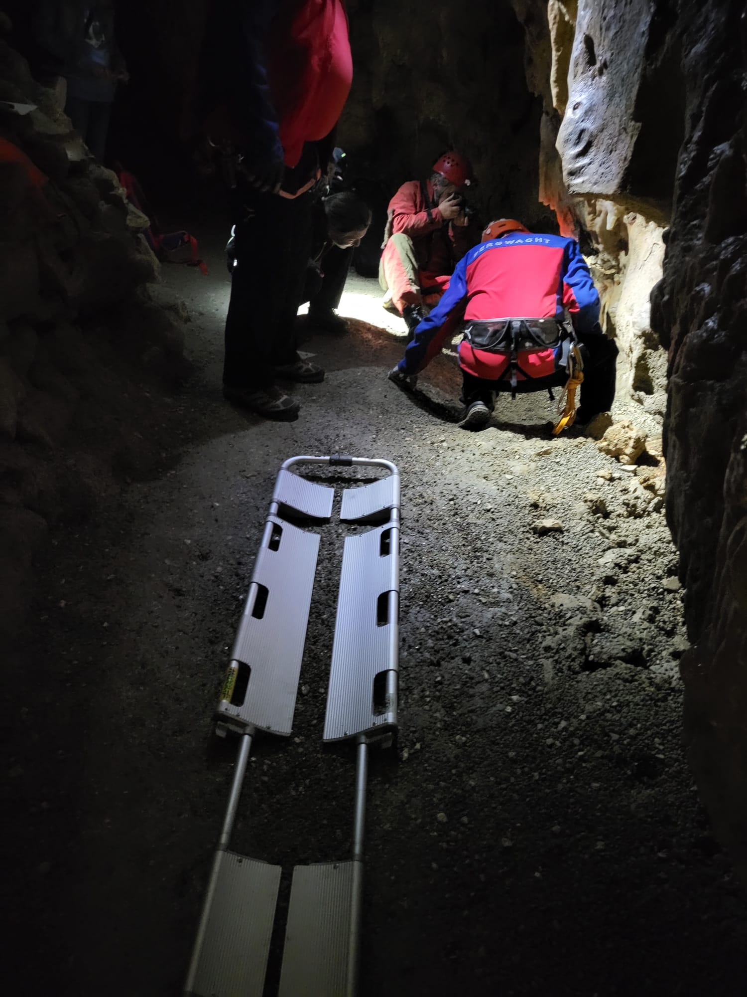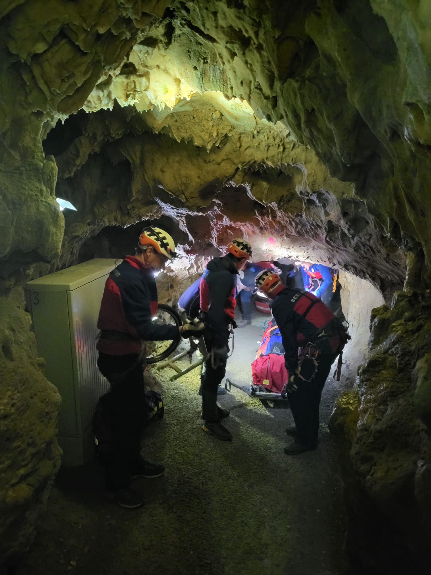 Insgesamt ca. 20 Einsatzkräfte, davon 14 der Bergwacht, übten den Ernstfall in der Charlottenhöhle. Der Höhlen-und Heimatverein Giengen- Hürben ist hier an offizielle Vorgaben zur Durchführung von Rettungsübungen gebunden. Das es immer wieder Vorfälle mit z. B. Bewußtlosigkeit und Kopfverletzungen bei Führungen gibt, bestätigte eine Sprecherin. Für das Übungszenario wurden zwei verletzte Personen in der Höhle angenommen welche nach erster Sichtung der Helfer vor Ort Gruppe des DRK Hürben auch nicht mehr gehfähig waren. Die nachrückende Mannschaft der Bergwacht und DRK Einsatzkräfte aus Hürben waren daraufhin mit einem Notarzt in kleinen Gruppen mit Rettungsmaterial zum Höhleneingang und weiter zu den Verletzten unterwegs. Eine bewustlose Person mit Schädel-Hirn Trauma erreichten die Retter im vorderen und eine weitere, mit Unterschenkelfraktur, im hinteren Teil der Höhle. Die Kommunikation erfolgte über das Höhlentelefon und über Personen welche als „Melder“ zu Fuß unterwegs waren. Mit Funkgeräten und Handy war in dieser Umgebung keine Verständigung möglich. Der bewustlose Verletzte im vorderen Teil hatte oberste Priorität bei Versorgung und Abtransport mit der Gebirgstrage durch die schmalen Höhlengänge und dem anschließenden steileren Fußweg zum Parkplatz. Dort fand die Übergabe an den Rettungsdienst statt. Der zweite Patient war ca. 300m vom Eingang entfernt in einer kleineren Seitenhöhle gelegen und die Verletzungen mußten dort behandelt werden. Hier ist die einrädrige Gebirgstrage für den Transport über längere Strecken die erste Wahl. Nur an der engsten Stelle auf dem Weg zum Eingang mußte die Person kurz mit dem Bergesack getragen werden, weil hier ein Durchkommen mit dem fahrbaren Untersatz nicht möglich war.