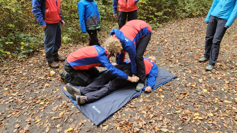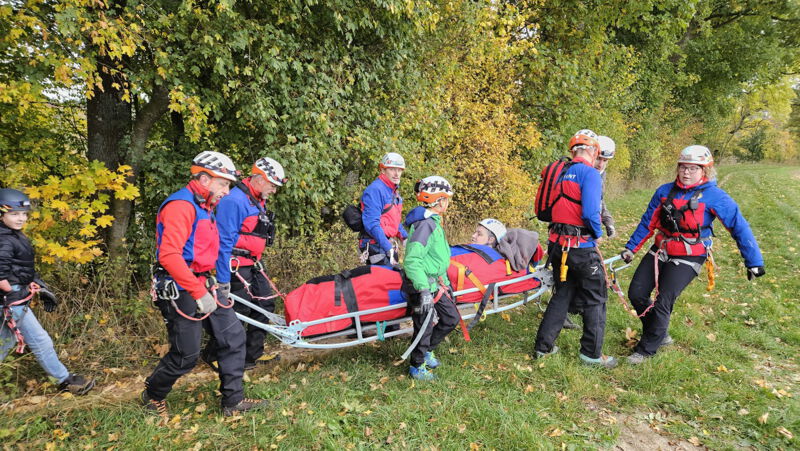 Am Samstag fand die abgespeckte Version der vorgesehenen 24 Stunden Übung statt. Insgesamt beteiligten sich 12 Einsatzkräfte und vier Jugendliche an der, wegen Sanierungsmaßnahmen in der Rettungsstation, nur eintägigen Übung. Bei drei Einsatzszenarien mit geschminkten Mimen im steileren Waldgelände und auf der Motocrossstrecke in Gerstetten, übte man die sanitätsdienstliche Versorgung, Aufbau der Satikseile, der anschließende Abtransport mit Gebirgs -und Rettungstrage sowie das Fahren im Gelände mit dem UTV (siehe Bilder) realistisch. Außerdem folgten auf der Hohen Wart noch verschiedene Fallbespiele mit aufgefundenen, verunfallten Personen. Hier war der Erstbefund und daraus resultierende Maßnahmen zur Stabilisierung der Patienten gefordert. Das Anlegen einer sogenannten "Beckenschlinge" zur Fixierung einer Beckenfraktur war ebenso Bestandteil im Vormittagsprogramm. Aus der Theorie und Praxis konnten tagsüber wieder einige Verbesserungen für künftige Einsätze gewonnen werden. Zwischen den praktischen Einheiten besuchte man die Höhenrettungsgruppe der Berufsfeuerwehr Ulm. Nach einem informativen Vortrag wurde das doch unterschiedliche Material der Höhenretter im Gegensatz zur Bergwacht vorgestellt aber auch die vielfälltige technische Ausrüstung der Feuerwehrfahrzeuge. Danach ging es, bedingt durch zwei reale Unfälle dort in diesem Jahr, zu Übungseinsätzen auf der Gerstetter Crossstrecke und weiter zur "letzten Station des Tages" in die Wirtschaft.